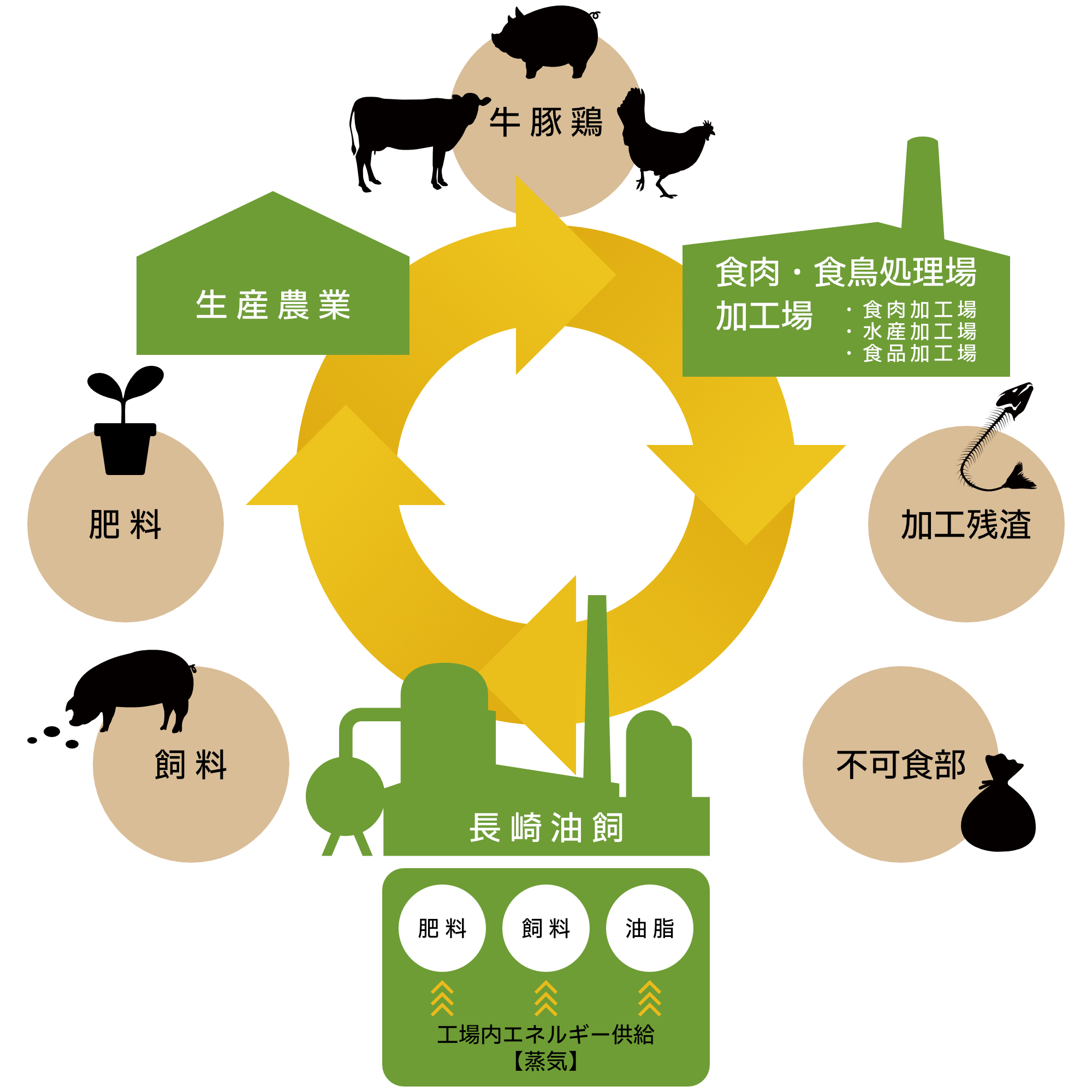 私たち長崎油飼工業は、畜産分野から生まれる副産物肥料・飼料・油等へ再生するレンダリング事業や廃棄物を燃焼して発電するボイラーの設置、その熱源を利用し工場内の稼働エネルギーとして使用しています。